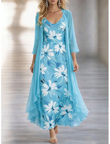 Per donna Insieme del vestito Abito a trapezio Elegante Vacanza Floreale Grafico Stratificato Stampato Abito maxi Manica 3/4 Scollo a V Quotidiano Feste Blu Rosa Viola Estate Primavera Vestibilit