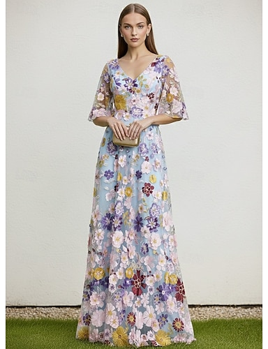 Linea ad A Lunghezza al pavimento Abito da cerimonia per signora Manica Corta Scollo a V Elegante Vintage Lussuoso Formale Ospite di nozze Ricevimento di matrimonio Chiffon Pizzo con Stampa floreale