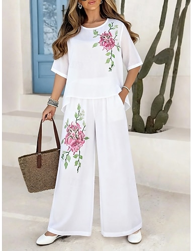 Per donna Set di Pantaloni Finto cotone e lino Mezza Manica Girocollo Floreale Elegante Moda Streetwear Casuale Quotidiano All'aperto Nero Bianco Rosa Primavera & Estate Vestibilità comoda