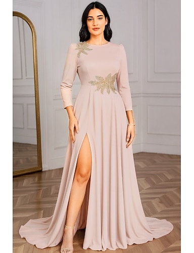 Linea ad A Lunghezza al pavimento Abito da Sera Elegante Spacco Alto Manica Lunga Girocollo Matrimonio Formale Crepe Elasticizzato con Volant Applicazioni
