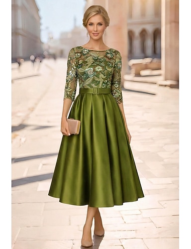 Linea ad A Lunghezza Tè Abiti da Cocktail Abiti da festa Elegante Vintage Manica 3/4 Collo quadrato Matrimonio Formale Tasca Raso con Fiocco/Fiocchi Tasca