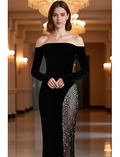 Abito a tubino colonna lungo fino al pavimento abito da sera elegante maniche lunghe scollato spalla abito da sera matrimonio con cristalli e perline