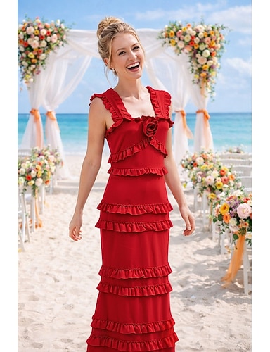 Tubino Colonna Lunghezza al pavimento Abito da invitata a nozze Abiti per invitati a matrimoni Elegante Senza Maniche Collo quadrato Matrimonio con Volant