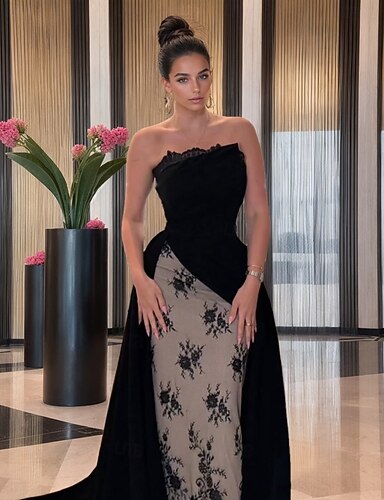 Sirena Tromba Strascico a Terra Abito da Sera Elegante Stile Celebrità Senza Maniche Senza Spalle Festa serale Matrimonio Raso con Sopragonna