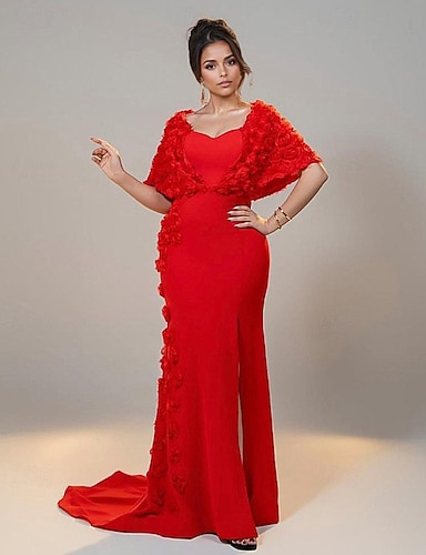 Tubino Colonna Lunghezza al pavimento Abiti da Ballo Abito da Sera Da principessa Elegante Manica 3/4 Scollo a V Festa in giardino Matrimonio Crepe Elasticizzato con Spacco Fiore sulla Spalla