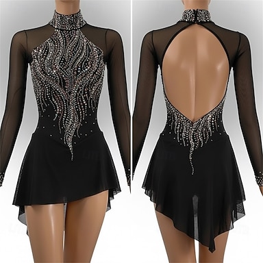 Abito da pattinaggio artistico Per donna Pattinaggio sul ghiaccio Vestito Nero Patchwork Schiena aperta Alta elasticità Allenamento Competizione Vestiti da pattinaggio sul ghiaccio Classico Cristallo