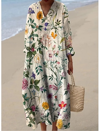Per donna Abito maxi Abito Boho Vestito Casual Abito a trapezio Abito Floreale Elegante Moda Moderno All'aperto Vacanza Uscire Vestibilità regolare Floreale Manica Lunga Scollo a V Beige Estate