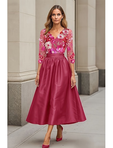 Linea ad A Lunghezza Tè Vestito da Festa Abito da Cocktail Abito da invitata a nozze Abito da cerimonia per signora Manica 3/4 Scollo a V Elegante Festa in giardino Matrimonio Formale Raso Crepe