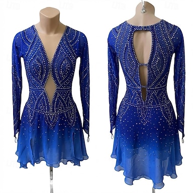 abito da pattinaggio artistico, abito da pattinaggio sul ghiaccio da donna e da ragazza, blu, elastico, allenamento, competizione, abbigliamento da pattinaggio, termico, caldo, cristalli/strass, senza