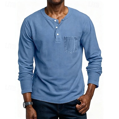 Per uomo maglietta Camicia Henley Magliette Maglia a maniche lunghe Liscio Henley Informale Per eventi Manica lunga Tasche Pulsante frontale Abbigliamento Cotone Di tendenza Originale Comodo Indicato