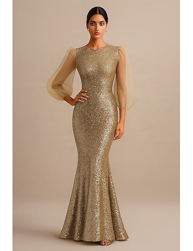 Sirena Tromba Lunghezza al pavimento Abito da Sera Elegante Scintillante Stile Celebrità Manica Lunga Girocollo Festa in giardino Matrimonio Organza Con Paillettes con Glitter