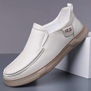 Mocassini da uomo bianchi in similpelle: scarpe eleganti minimaliste senza lacci, perfette per un look casual-chic, per il lavoro, le feste e l'uso quotidiano.