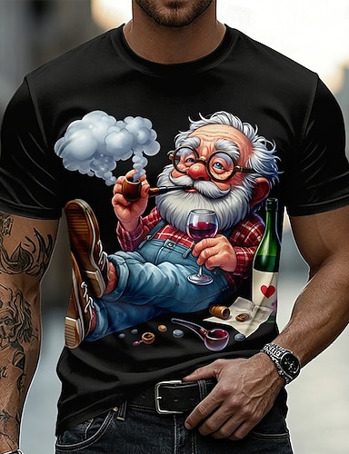 Maglietta da uomo con grafica 3D divertente e spiritosa di un vecchio felice che fuma la pipa e beve vino, girocollo, maniche corte, regalo di pensionamento per il nonno, amante del vino, compleanno,