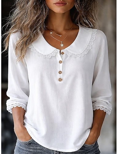 Per donna Camicia popover Camicia casual Blusa Pizzo Bottoni Tinta unica Vacanza Elegante Casual Manica Lunga Collo ripiegato Top Regolari Quotidiano Spiaggia Ferie Bianco Estate Primavera Autunno