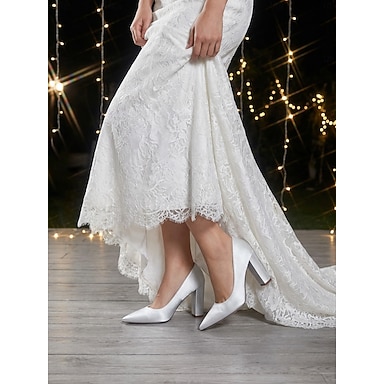 décolleté da donna con tacco a blocco in raso color avorio, eleganti scarpe da sposa minimaliste per un matrimonio in città moderna