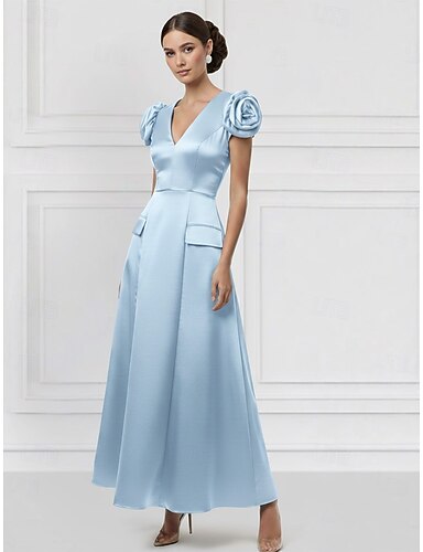 Linea ad A Lunghezza al pavimento Abito da Sera Elegante Manica Corta Scollo a V Matrimonio Formale Tasca Raso Elasticizzato con Fiore sulla Spalla