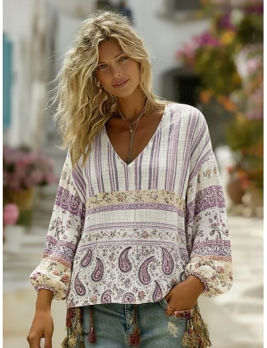 Per donna Camicia Camicia Boho Finto cotone e lino Stampato Floreale Paisley Bohemien Vintage Classico Manica Lunga Scollo a V Top Regolari Quotidiano Ferie Uscire Viola Estate Primavera Autunno