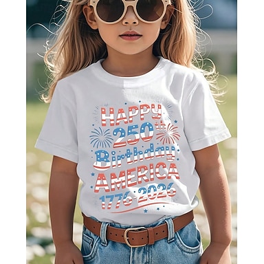 100% Cotone Bambini Ragazze Nero Bianco Grafico Bandiera USA 250° anniversario Bandiera americana per bambini Maglietta Girocollo Manica Corta Vacanza Sport & Outdoor Abbigliamento Quotidiano Attivo