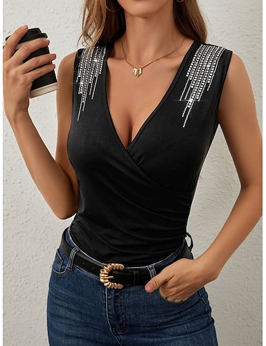 Per donna Maglietta Arricciato Con diamantini Tinta unica Elegante Sexy Senza Maniche Scollo a V Top Regolari Uscire Abiti da festa Nero Estate Primavera