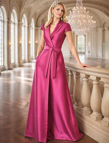 Linea ad A Lunghezza al pavimento Abito da invitata a nozze Abito Formale Abito da sera Abito da cerimonia per signora Manica Corta Bavero Elegante Vintage Matrimonio Formale Raso con Fiocco/Fiocchi