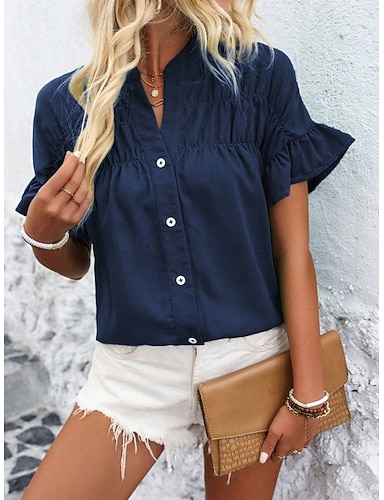 Per donna Camicia Estiva Camicia casual Blusa Arricciato Volant Bottoni Tinta unica Vacanza Quotidiano Elegante Manica Corta Scollo a V Top Regolari Quotidiano All'aperto Ferie Nero Giallo Rosso Blu