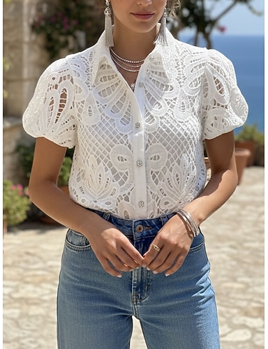 Camicia Camicia in pizzo Blusa Camicia di pizzo bianco Per donna Nero Bianco Liscio Pizzo Tunica fluente Strada Giornaliero Di tendenza A V Standard S