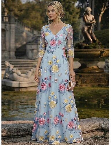 Linea ad A Abito Lunghezza al pavimento Abito da cerimonia per signora Manica 3/4 Scollo a V Elegante Lussuoso Formale Ospite di nozze Semi-Formale Organza Jacquard con Blocco di Colore