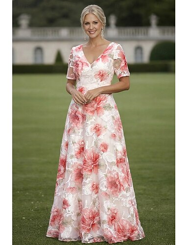 Linea ad A Abito Lunghezza al pavimento Vestito maxi Abito da cerimonia per signora Manica Corta Scollo a V Elegante Lussuoso Formale Ospite di nozze Derby del Kentucky Organza Jacquard con Stampa