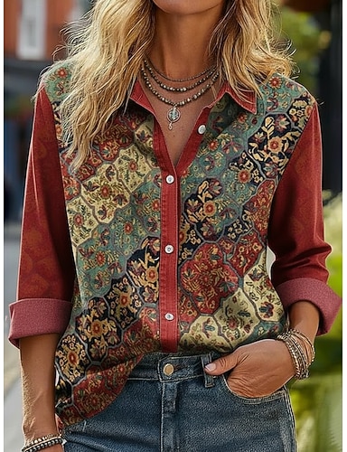 Per donna Camicia Blusa Patchwork Bottoni Stampato Grafico Paisley Astratto Vintage Western Casual Manica Lunga Colletto a Camicia Top Regolari Quotidiano Marrone Beige Estate Primavera Autunno