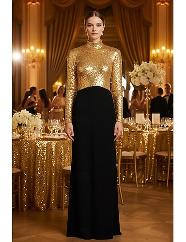 Tubino Colonna Lunghezza al pavimento Abiti da Ballo Abito da Sera Da principessa Abito formale Elegante Scintillante Stile Celebrità Manica Lunga Collo Alto Festa in giardino Matrimonio Crepe