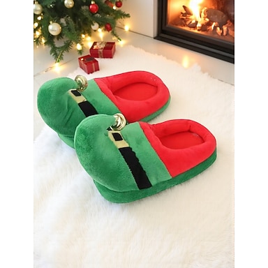 pantofole da elfo natalizio da donna, in pile accogliente con finta cintura, calzature natalizie rosse e verdi per feste di Natale e comfort festivo