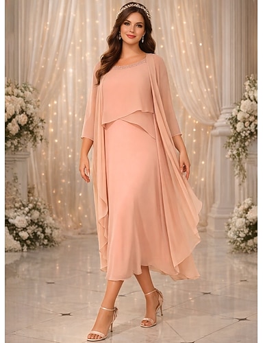 Due Pezzi Linea ad A Lunghezza Tè Abito da invitata a nozze Abito da cerimonia per signora Manica 3/4 Collo gioiello Elegante Ospite di nozze Festa di fidanzamento Chiffon con Perline