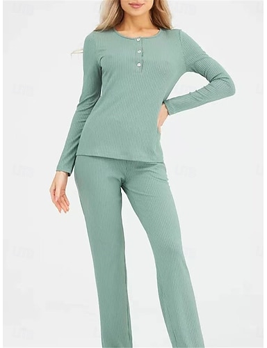pigiama da donna set colore puro moda base comfort casa quotidiano letto maglia traspirante v wire manica lunga maglione pantaloni bottone elastico in vita autunno inverno casa abiti