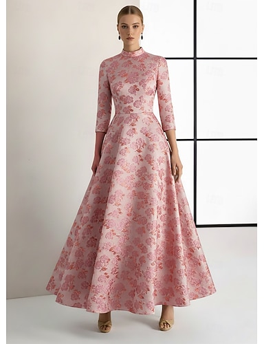 Linea ad A Lunghezza al pavimento Abito da Sera Elegante Vintage Manica 3/4 Collo Alto Matrimonio Formale Nylon Jacquard con Stampa floreale Tasca