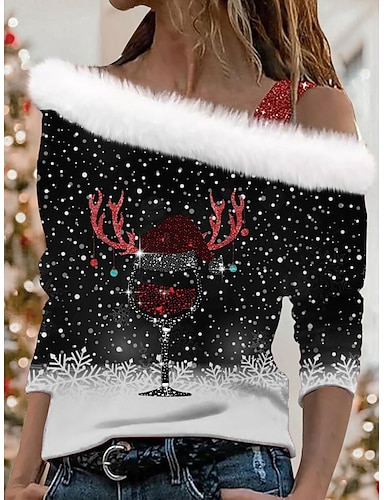 Camicia da donna di Natale Fiocco di Neve Blusa Casual Spiaggia Maniche Lunghe Spalle Scoperte Tops Regolari Giornaliero Stampa Patchwork Nera Vino Rossa Grigia Primavera Autunno Inverno