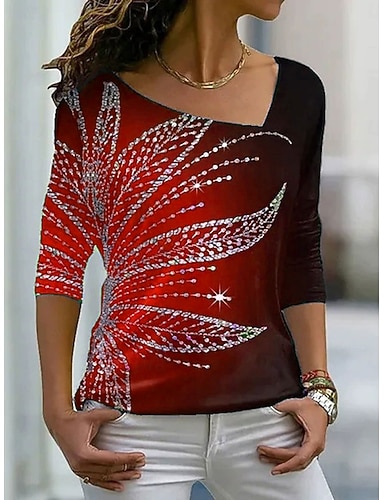 T-Shirt Ombre Grafica Geometrica Vintage Elegante Moderna Maniche Lunghe Collo Asimmetrico Regolari Top Quotidiani Stampa Rossa Arancione Verde Autunno