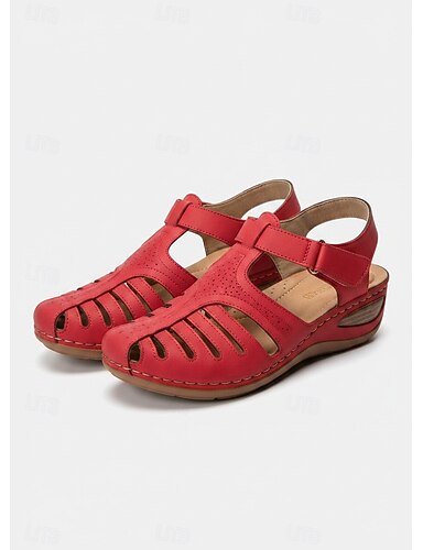 sandali rossi da donna con tacco spesso e chiusura a cerniera, design traforato per feste in giardino e abbigliamento casual