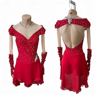 Abito da pattinaggio artistico Per donna Pattinaggio sul ghiaccio Vestito Rosso Patchwork Schiena aperta Spandex Rete Alta elasticità Allenamento Competizione Vestiti da pattinaggio sul ghiaccio