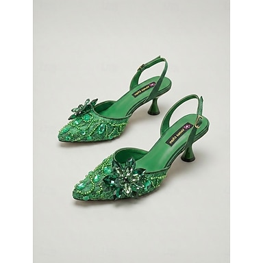 Décolleté da donna verdi con cinturino posteriore e decorazioni, punta affusolata, con cristalli e decorazioni floreali, perfette per cocktail party ed eventi serali. &una serata speciale