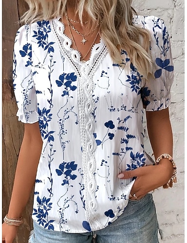 Per donna Blusa Pizzo Patchwork Stampato Floreale Elegante Casual Manica Corta Scollo a V Top Regolari Quotidiano Blu Bianco Azzurro cielo Arancione Estate Primavera