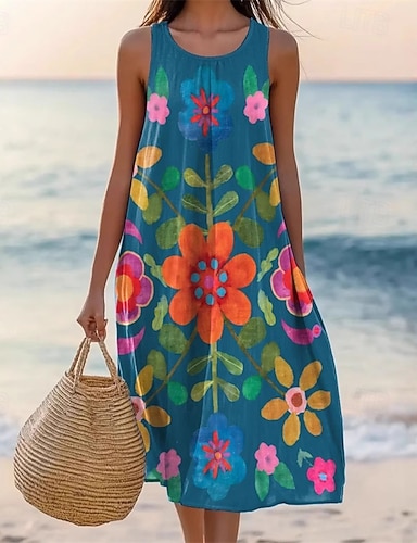 Per donna Abito Midi Vestito Casual Abito Estivo Moda Moderno Quotidiano Spiaggia Weekend Vestibilità regolare Fiore Senza Maniche Girocollo Blu Primavera Autunno