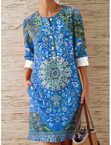 Per donna Abito al ginocchio Abito Vintage Vestito Casual Vintage Vestibilità regolare Boho Grafico Manica Lunga Scollo a V Blu Viola Arancione Verde Estate Primavera