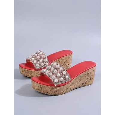 Eleganti sandali con zeppa da donna neri con perle sintetiche, perfetti per crociere e feste serali sul ponte. &abbigliamento da resort di lusso