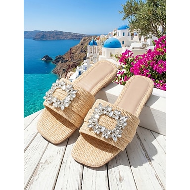 pantofole da donna in paglia intrecciata con dettaglio fibbia in cristallo – sandali piatti eleganti e comodi per le vacanze estive, le giornate in spiaggia e le uscite informali