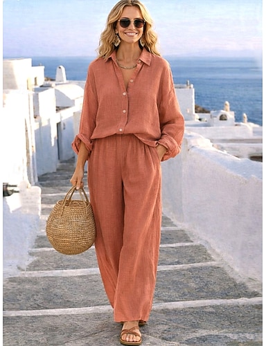 Per donna Set di Pantaloni Manica Lunga Colletto a Camicia Tinta unica Moda Streetwear Casuale Quotidiano All'aperto Arancione Estate Vestibilità comoda