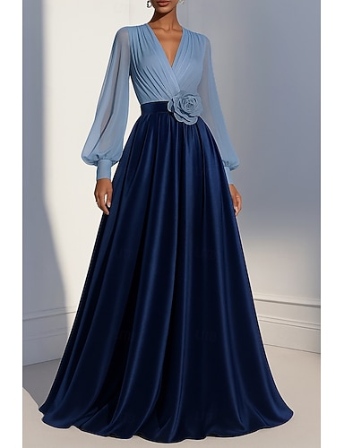 Linea ad A Lunghezza al pavimento Abito da Sera Da principessa Abito formale Elegante Monocolore Setoso Manica Lunga Scollo a V Matrimonio Formale Tasca Chiffon Raso con Fiore ricamato