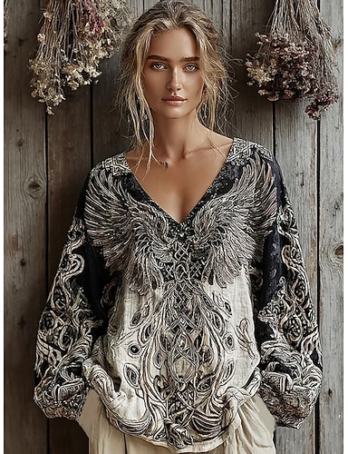 Blusa da donna per festival musicale in lino come traspirante leggera tunica scollo a V a maniche lunghe boho casual top grafica geometrica elegante vintage tropicale top regular quotidiano stampa