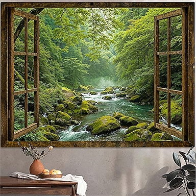 natura foresta finestra vista arazzo da parete verde fiume ruscello muschio rocce paesaggio arte murale per camera da letto soggiorno arredamento casa
