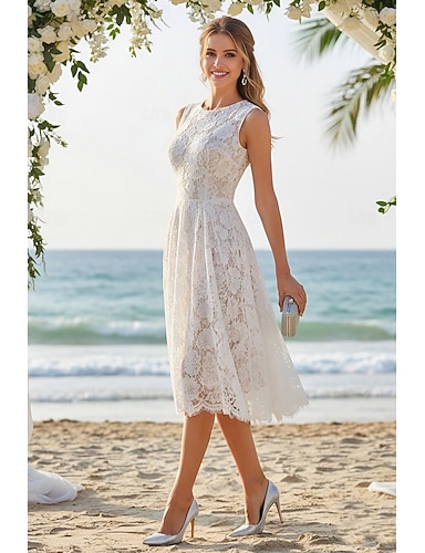 Linea ad A Lunghezza Tè Abito in Pizzo Piccolo vestito bianco Elegante Piccoli Abiti Bianchi Senza Maniche Girocollo Matrimonio con Pizzo Pieghe
