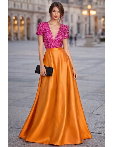 Linea ad A Lunghezza al pavimento Abito da Sera Elegante Monocolore Manica Corta Scollo a V Matrimonio Formale Tasca Raso Con Paillettes con Pieghe Paillettes